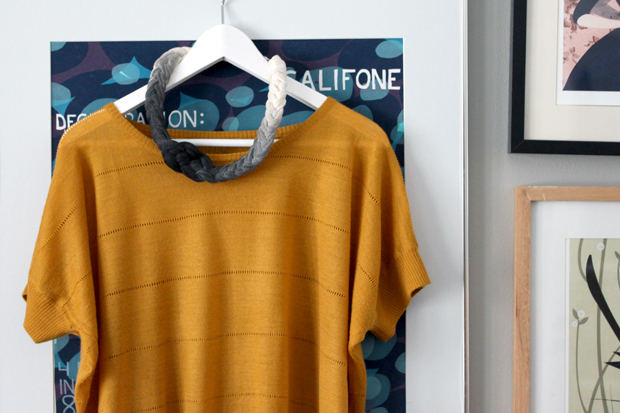 Löysin netistä hyvän ohjeen solmimalla tehtävään kaulakoruun. Hakusanoilla diy rag scarf tai diy braded scarf löytyy mallia erilaisille huiveille ja koruille vaikka millä mitoin. Myös vanhat t-paidat ja muut trikoovaatteet sopivat koruun mainiosti. Myös tämän tekemäni merimiessolmukorun ohje löytyy netistä.