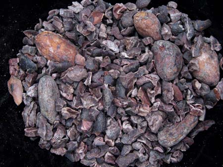 Raakakaakaota myydään Suomessa sekä kaakaonibseinä (kuvan hippuset) että kokonaisina kaakaopapuina. Molemmat ovat siis samaa tavaraa, nibsit ovat murskattuja papuja.