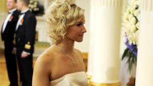 Hanna-Maria Seppälän helmenvaalea satiinipuku sekä Linnan juhlien muut vaaleat juhla-asut kuvagalleriassa. Vaikuttavatko vaaleat kaunottaret varovaisilta?