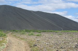Dimmuborgirilta vie polku läheiselle Hverfell-tulivuoren kraatterille. Kuvan vaalea viiva on polku rinteessä, se nousee lähes suorana tasangolta 140 metriä korkeammalle. Tosin polun ylempi puolisko on niin jyrkkä, että sitä edetään muutaman metrin siksakkia. Paluumatkalla riehaannun pujotellen juoksemaan alas adrenaliinituiskeessa.