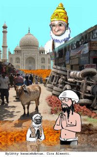 Intia-kirjan tapauksessa jouduin käymään monipoimuisen taistelun kannen harmaata perusilmettä vastaan. Graafikolla oli menossa harmaa kausi, ja hänen mielestään harmaa kuvasi osuvimmin intialaista värimaailmaa. Omat kokemukseni muutamalta eri matkalta ja noin vuoden oleskelusta Intiassa eivät tukeneet harmaa-teoriaa millään tavoin. Toki myönnän, etten ole viettänyt montaa kuukautta peräkkäin monsuunisateissa, eli harmaakin saattaa kuvata osuvasti jotain tiettyä ajankohtaa esimerkiksi sementtitehtaitten liepeillä. Mutta kun se matkani sijoittui vain monsuunin viimerippeisiin ja sementtitehtaittenkin ohi pääsin aika nopeasti. Ristiretkeni harmaata vastaan onnistui kuitenkin vain osittain, ja kirjan kannesta tuli lopulta kohtuullinen kompromissi.