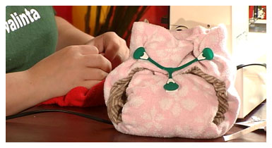 Imuosiksi leikattiin vaippaosaa hieman pienempiä, tiimalasin muotoisia kappaleita flanellista ja froteepyyhkeestä.