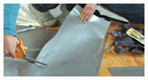 Laura leikkasi henkselit ja vyön käyttäjän mittojen mukaan. Nauhan leikatut päät kannattaa sulattaa tulen liekillä, jotta leikatun reunan kuitujen päät sulavat, eikä nauha purkaudu.