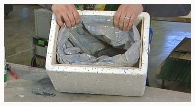 Tähän Mikko hyödynsi vanhaa liimaämpäriä. Mikko leikkasi mattopuukolla ämpäristä reunuksen irti. Reunuksen avulla muovikassi saatiin suustaan pingotettua laukkuun.