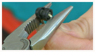 Sitten päästiin kokoamaan säilytyssysteemiä. Aija katkaisi ketjusta kuusi sopivan mittaista pätkää. Ketjuille Aija teki stopparit verhonipsuista: Aija poisti niistä nipistinosat ja väänsi pihdeillä muovirullia pitävän osan auki, jolloin rullat putosivat pois. Aija laittoi aukaistun osan ketjun lenkkiin ja väänsi rullien kanssa takaisin kiinni. Työ vaatii melkoisesti sorminäppäryyttä, mutta onnistuu kyllä! Ja näin saadaan ketjun päähän pitävä stoppari.