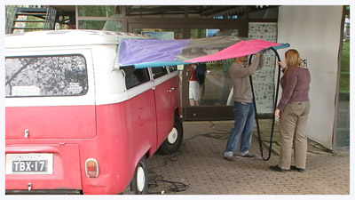 Surffipurjetta kannetaan sisään(copyright YLE/videokuvaa)Pakettiautolla reissaavat tietävät, että auton sisätilat ovat pienet ja usein tulee tarvetta suurempaan tilaan. Tähän ongelmaan juuri tämä sovellus antaa ratkaisun. Lisäkatos pakettiautoon syntyy helposti yhdistämällä purje, puomi, vararengas ja muutama pressun kiinnike.