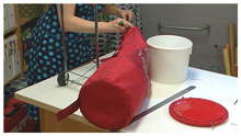 8. Kantta varten leikattiin kantta suurempi ympyrä. Siihen sovitettiin pala tarranauhaa. Nauha ommeltiin. Kangas pingotettiin kannen peitoksi. Kangas kiinnitettiin kaksipuolisen teipin avulla. Liestyvä kangas huoliteltiin teipillä sekä kontaktimuovilla. Takista purettu vetoketju ommeltiin kannen reunaan somisteeksi.