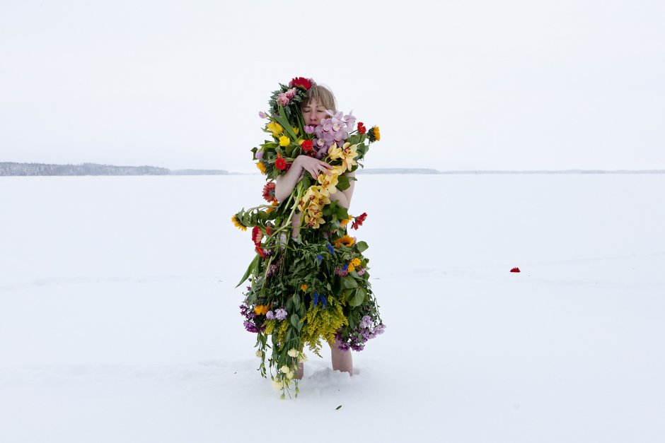 Kylmyydessä vaatteettoman ihmisen toimintakyky lakkaa hyvin nopeasti. Essi käveli videokameran editse muutaman kerran ja alkoi sitten täristä holtittomasti. Jouduimme lopettamaan aika lyhyeen, mutta video saatiin kuvattua. Jäällä ulkoilevat ihmiset pysähtyivät tuijottamaan kukkiin verhoutunutta naista.